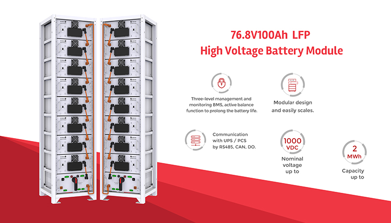 76.8V100Ah高压电池系统采用标准19英寸机架和清洁设计,经过模组串并联组成集装箱式储能系统,单个集装箱可高达2MWh的并行容量,可以满足中小型商业和工业储能备电需求。