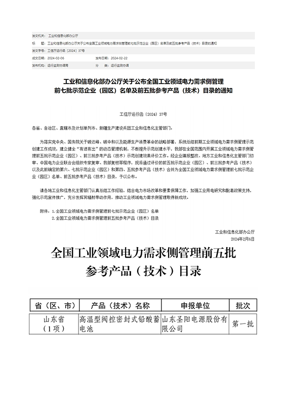 近日,国家工业和信息化部办公厅发布《全国工业领域电力需求侧管理前七批示范企业(园区)名单》和《全国工业领域电力需求侧管理前五批参考产品(技术)目录》,william威廉中文官网股份高温型阀控密封式铅酸蓄电池列入全国工业领域电力需求侧管理第一批参考产品(技术)目录。